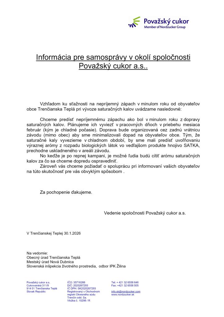 Informácia od spoločnosti Považský cukor a.s. z dôvodu sťažnosti na nepríjemný zápach.