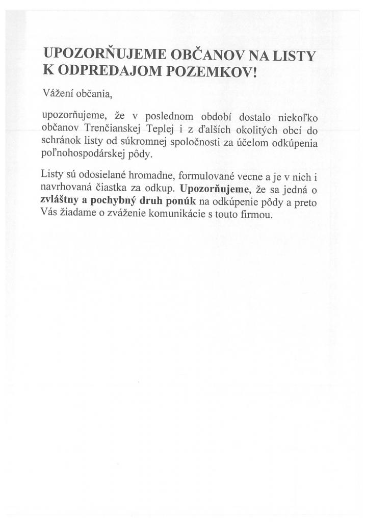 Upozorňujeme občanov na listy k odpredaju pozemkov !