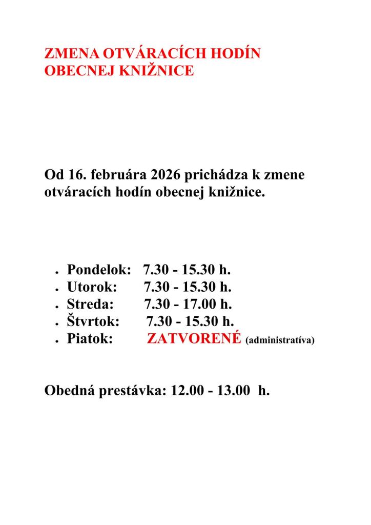 Od pondelka 16. februára 2026 prichádza k zmene otváracích hodín.